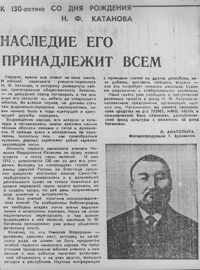 Анатольева, Л. Наследие его принадлежит всем / Л. Анатольева // Хакасия. – 1992. – 27 февраля.