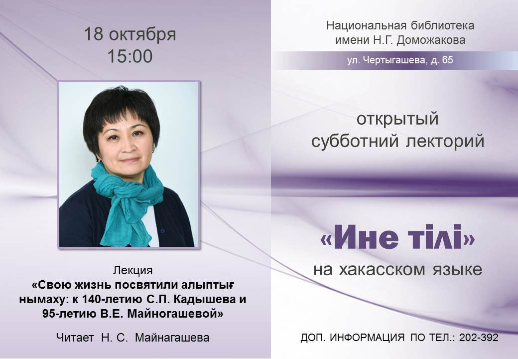 18 октября состоится лекторий на тему «Алыптығ нымахха чуртастарын чарытханнар» (Свою жизнь посвятили алыптығ нымаху): к 140-летию С.П. Кадышева и 95-летию В.Е. Майногашевой.