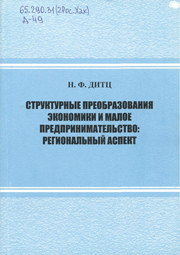 Дитц Н. Ф. Структурные преобразования экономики и малое предпринимательство: региональный аспект / Н. Ф Дитц ; Федер. агентство по образованию, Хакас. гос. ун-т им. Н. Ф. Катанова. – Абакан : Изд-во Хакас. гос. ун-та, 2008. – 108 с. : табл. ; 21 см. – Библиогр.: с. 104-108 (124 назв.). – 100 экз. – ISBN 978-5-7810-0527-7. – [11-48]