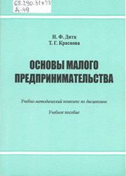 Дитц Н. Ф. Основы малого предпринимательства: учеб.-метод. комплекс по дисциплине : учеб. пособие / Н. Ф Дитц, Т. Г. Краснова ; Федер. агентство по образованию, Хакас. гос. ун-т им. Н. Ф. Катанова. – Абакан : Изд-во Хакас. гос. ун-та, 2009. – 148 с. : табл. ; 21 см. – Библиогр.: с. 140-148 (219 назв.). – 150 экз. – ISBN 978-5-7810-0628-1. – [11-84]