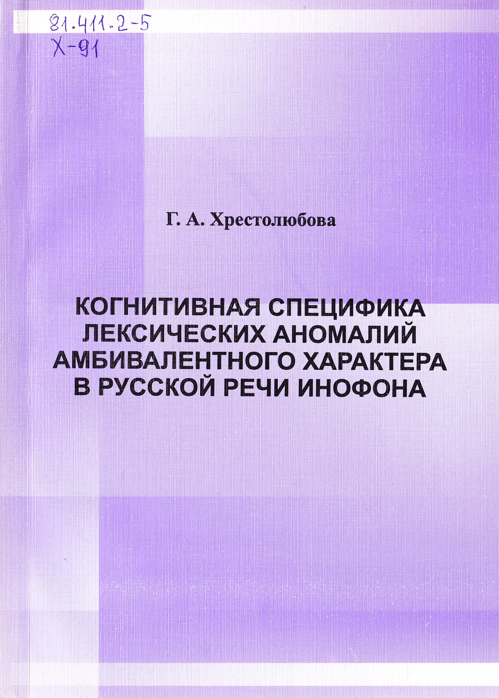 Хрестолюбова, Г. А. Когнитивная специфика лексических аномалий амбивалентного характера в русской речи инофона : [монография] / Г. А. Хрестолюбова ; М-во образования и науки Рос. Федерации, Хакас. гос. ун-т им. Н. Ф. Катанова. – Абакан : Изд-во Хакас. гос. ун-та, 2011. – 111 с. : ил. ; 20 см. – Библиогр.: с. 101-111. – 100 экз. – ISBN 978-5-7810-0736-3. – [15-42]