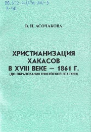 Асочакова В. Н. Христианизация хакасов в XVIII веке - 1861 г. (до образования Енисейской епархии) / В. Н. Асочакова ; науч. ред. Г. Ф. Быконя. – Абакан : Изд-во Хакас. гос. ун-та, 2008. – 246 с. ; 20 см. – Библиогр.: с. 233-246 (236 назв.). – 100 экз. – ISBN 978-5-7810-0530-7. – [09-237]